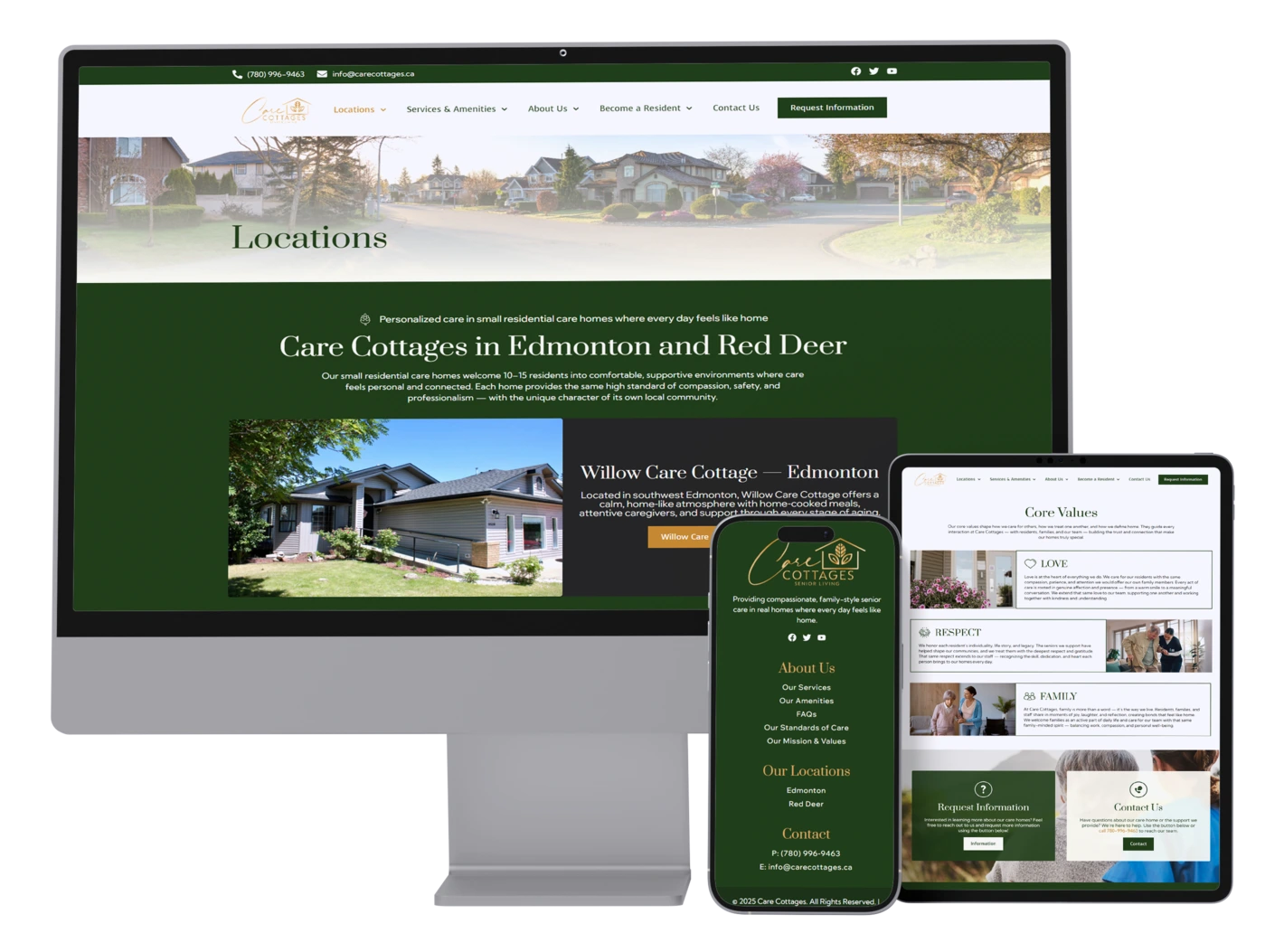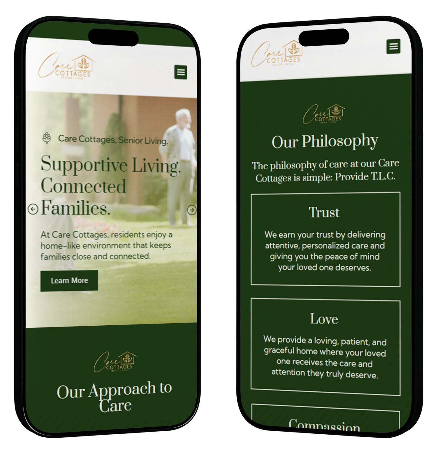 The website was designed to feel inviting and reassuring from the first interaction. A soft, warm visual theme paired with natural green tones was used to promote feelings of health, wellness, and comfort to reflect the peaceful, home-like environment Care Cottages provides. Clear navigation, plain-language content, and thoughtful layouts made it easy for families to understand care options, explore locations, and find answers without friction.