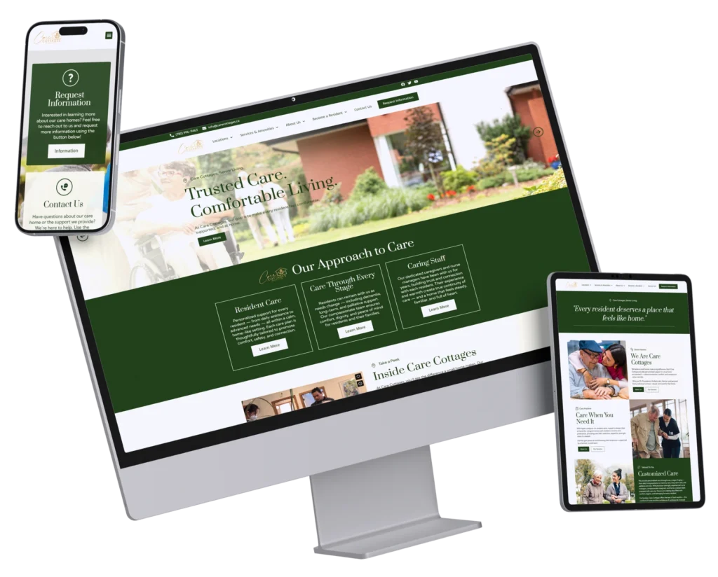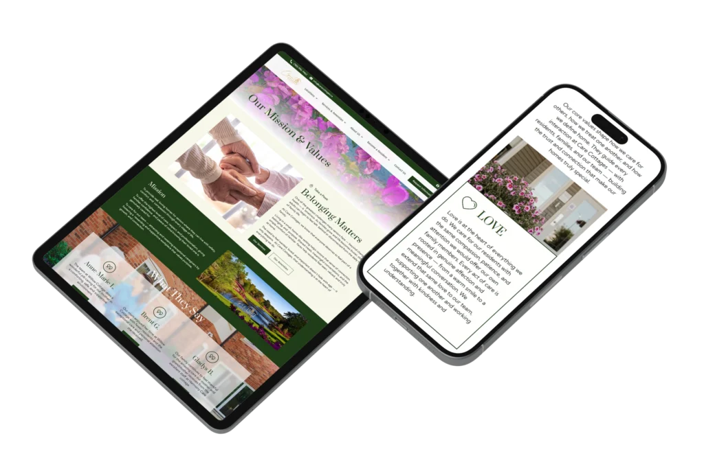 The completed website delivers a compassionate digital experience that mirrors the care provided inside each home. With clearer messaging, intuitive navigation, and a calming visual identity, Care Cottages is now better positioned to connect with families, support continued expansion, and build trust at a critical moment in their decision-making journey.